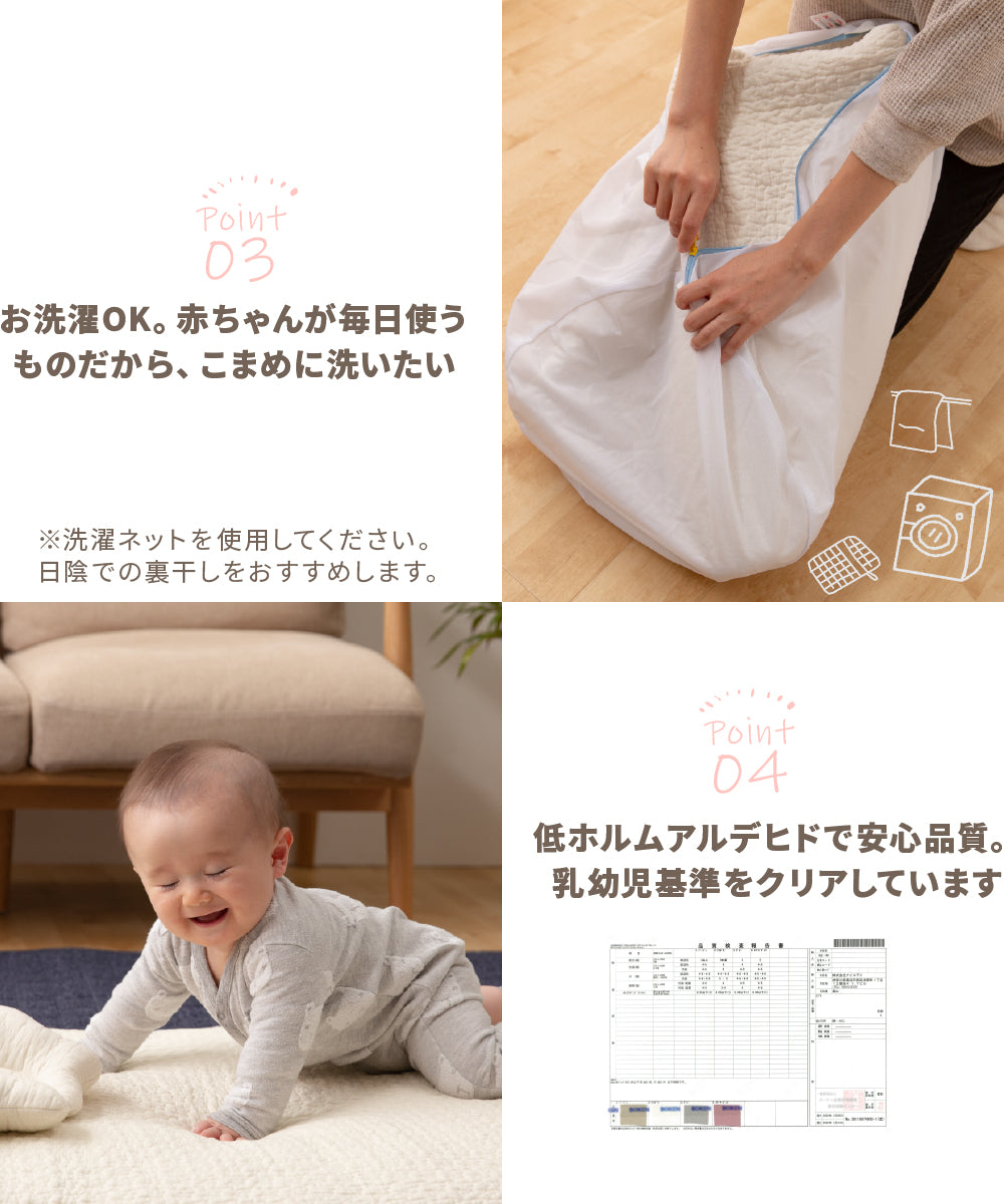 綿100%生地だから肌触りもやさしく、デリケートな赤ちゃん肌にも安心して使えます。