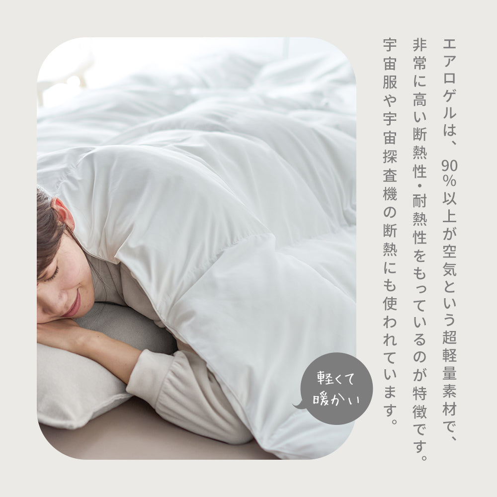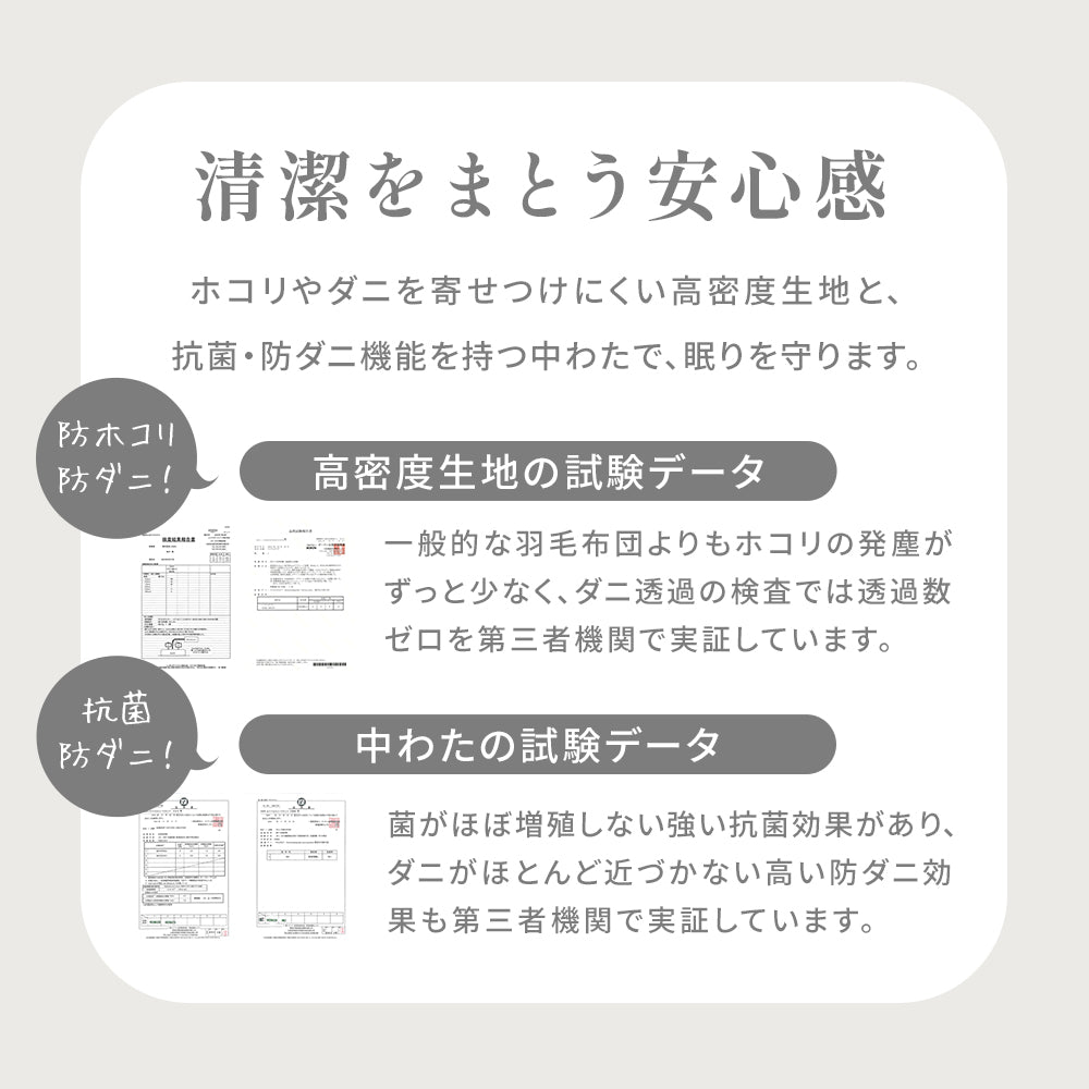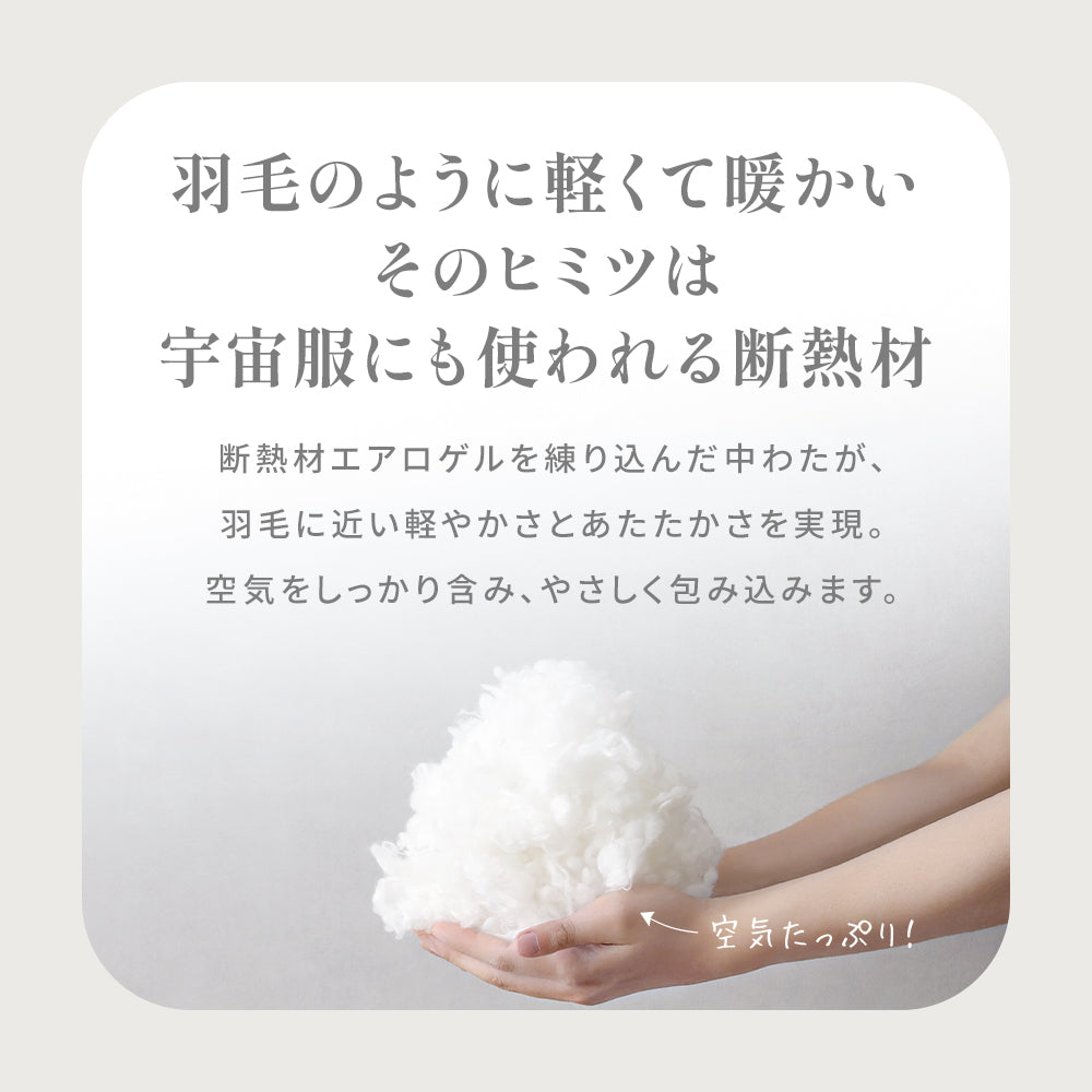宇宙服にも使われる「エアロゲル」を混ぜ込んだ中わたを使用した人工羽毛の布団、まるで羽毛のような暖かさ丸洗いできる軽ふわ掛け布団 [エアロゲル綿入り] 。軽くてふんわり、しっかりあたたかく体を包み込みます。ホコリが出にくいから清潔で安心。さらに自宅で丸洗いできるのでいつでも快適。羽毛の良さはそのままに、お手入れがラクで扱いやすい、いいとこ取りの寝具です。