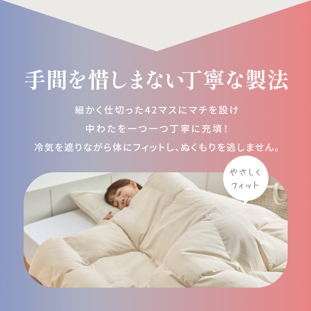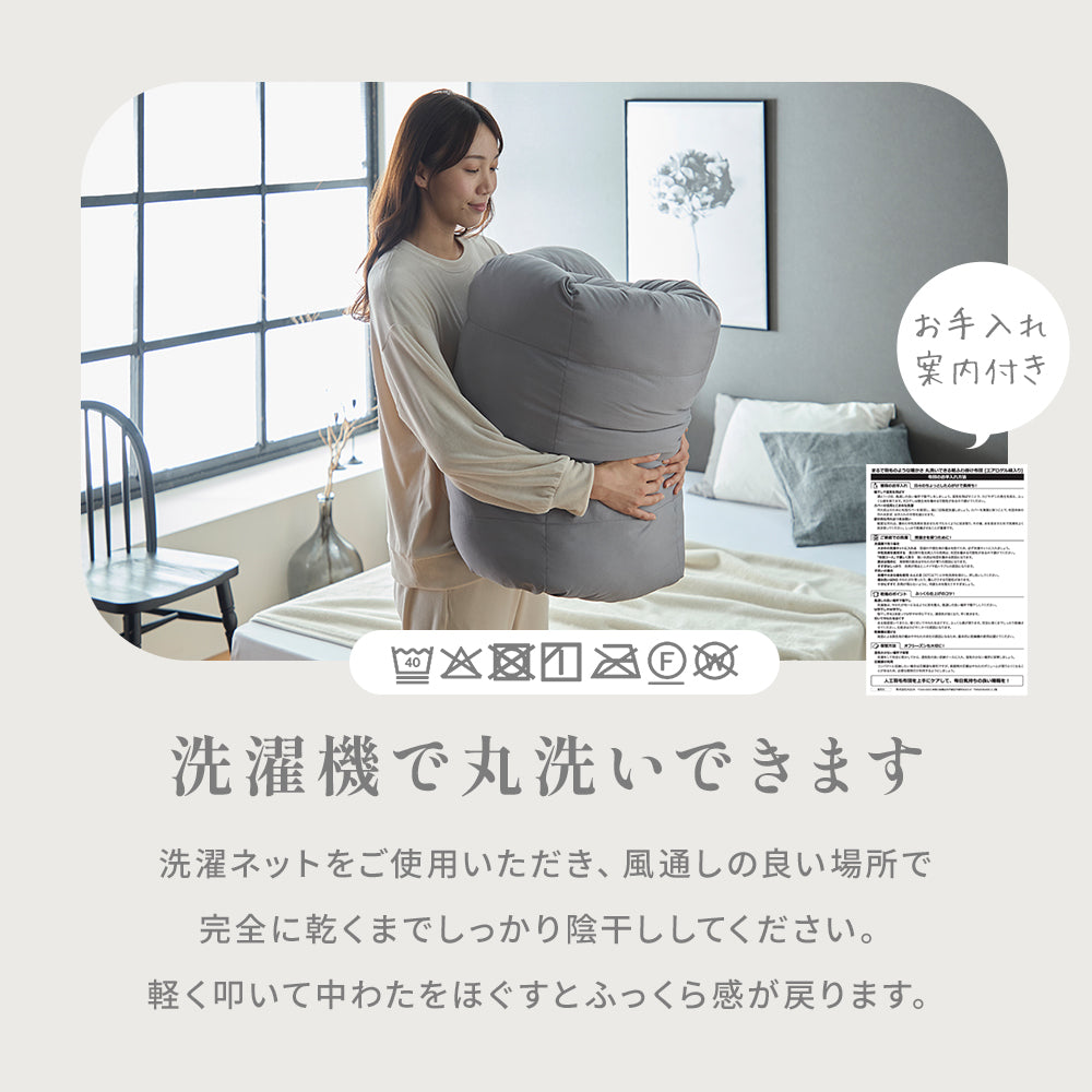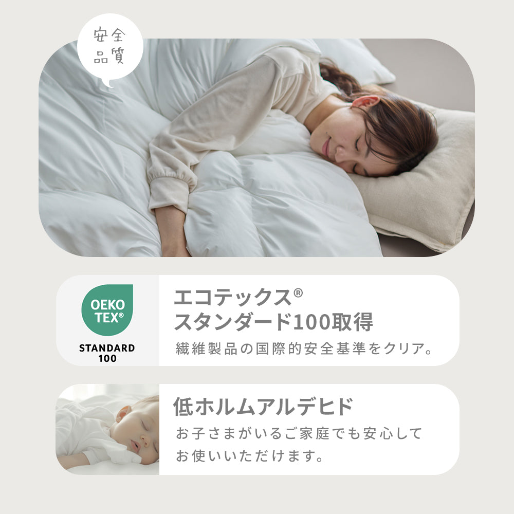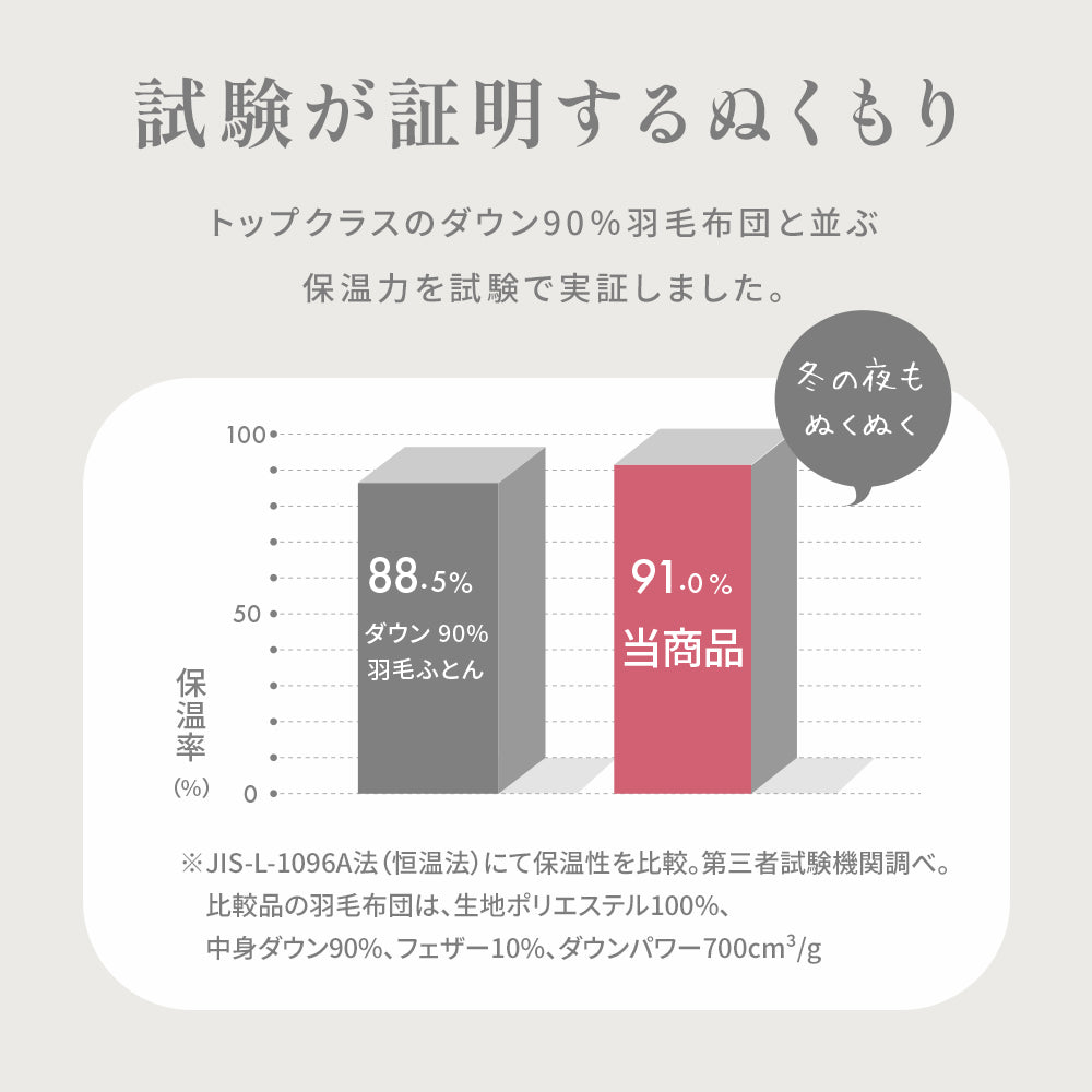 宇宙服にも使われる「エアロゲル」を混ぜ込んだ中わたを使用した人工羽毛の布団、まるで羽毛のような暖かさ丸洗いできる軽ふわ掛け布団 [エアロゲル綿入り] 。軽くてふんわり、しっかりあたたかく体を包み込みます。ホコリが出にくいから清潔で安心。さらに自宅で丸洗いできるのでいつでも快適。羽毛の良さはそのままに、お手入れがラクで扱いやすい、いいとこ取りの寝具です。