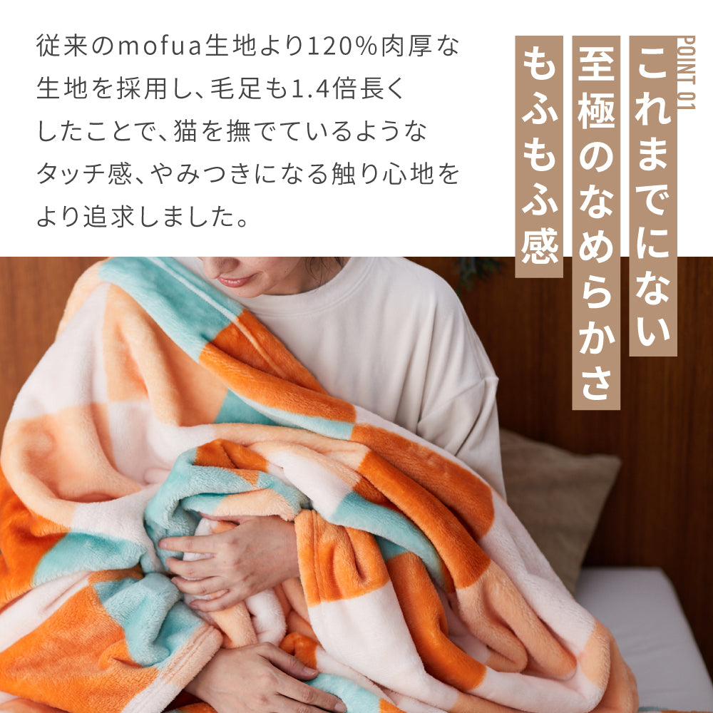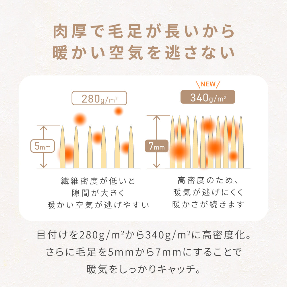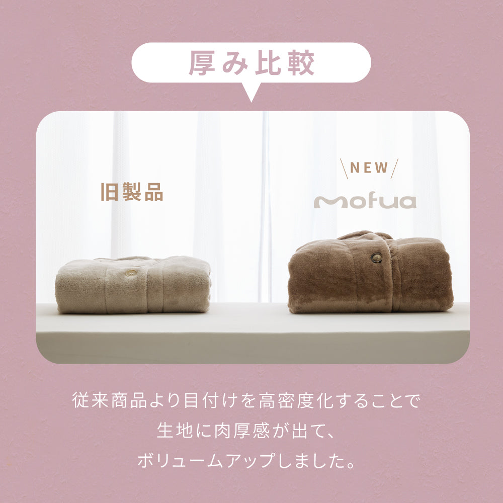 mofua プレミアムマイクロファイバー ノーマルタイプと、Heatwarm発熱 +2℃ タイプのいいとこどりしたアップデートバージョンが登場!ノーマルタイプ(従来品)のmofua生地より120%肉厚な生地を採用し、毛足も1.4倍長くしたことで、猫を撫でているようなタッチ感とやみつきになる触り心地よさをより追求しました。プラス2℃の吸湿発熱効果はそのままに、抗菌防臭機能をプラスし、ニオイの原因となる菌の発生を抑えるから冬場の寒い季節、洗濯で乾きにくい時も安心です。