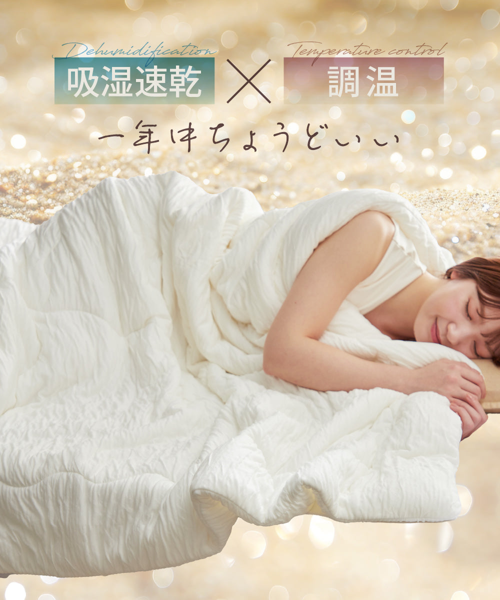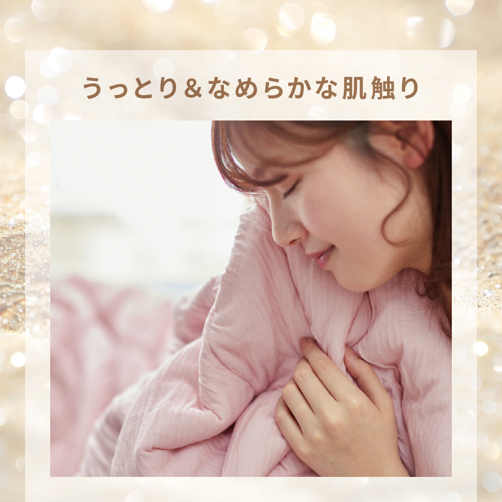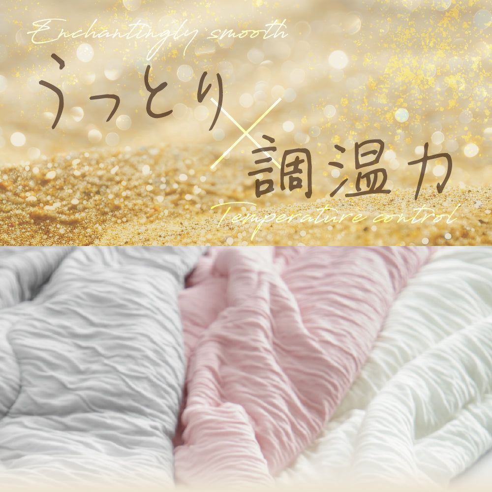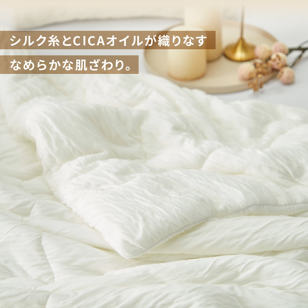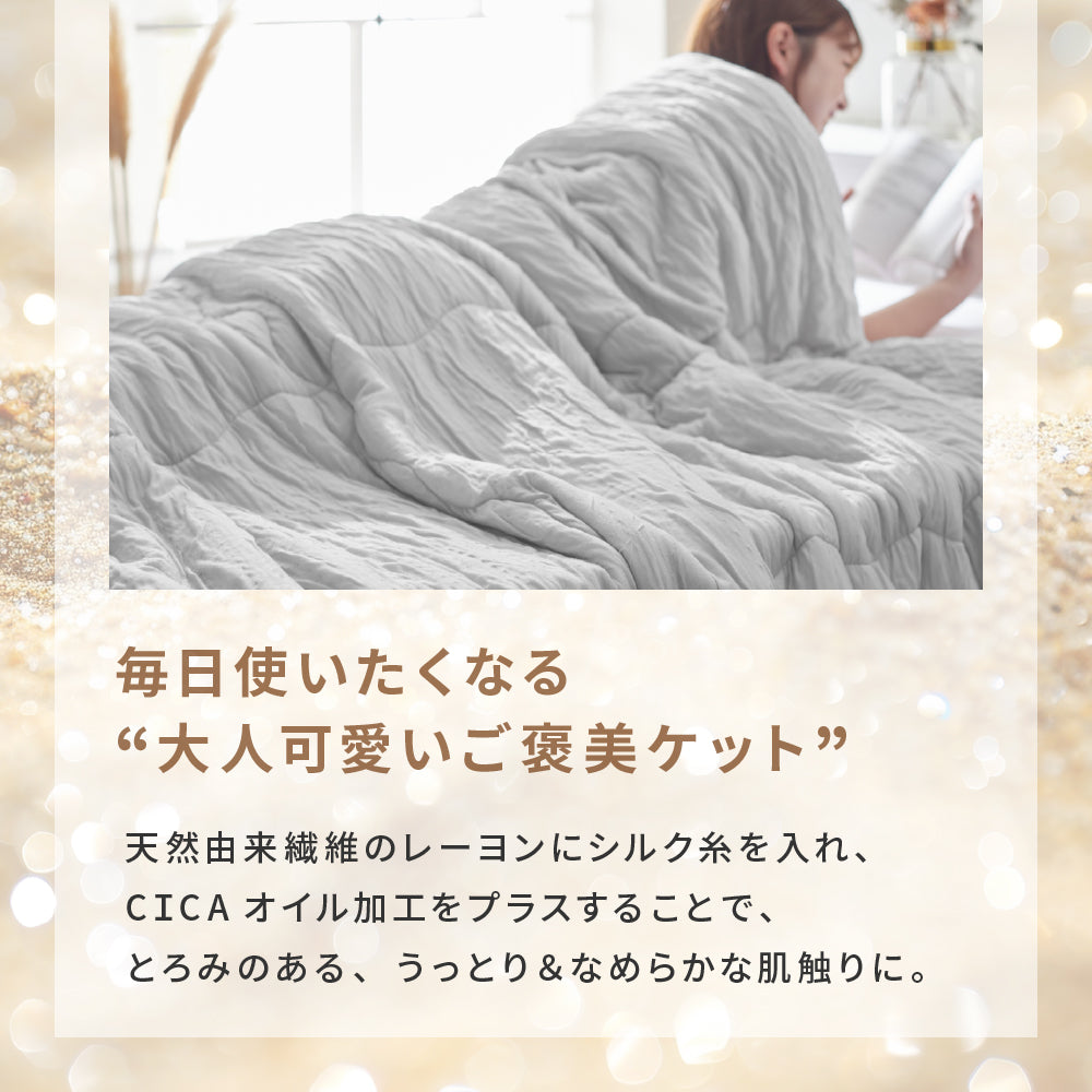 天然由来繊維のレーヨンにシルク糸を織り込み、CICAオイル加工をプラスした、とろみのある、うっとりなめらかな肌触りの掛け布団です。調温わたが体温に合わせて快適な温度を保ち、吸湿速乾仕様で梅雨や夏でもじめっとしない。オールシーズン使える、大人可愛いご褒美ケットです。お家で気軽にお洗濯できます。