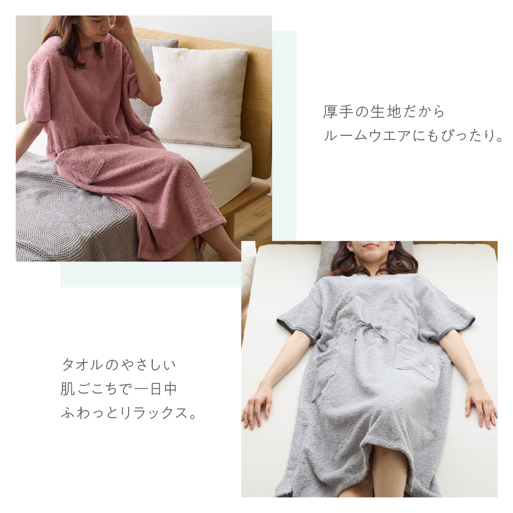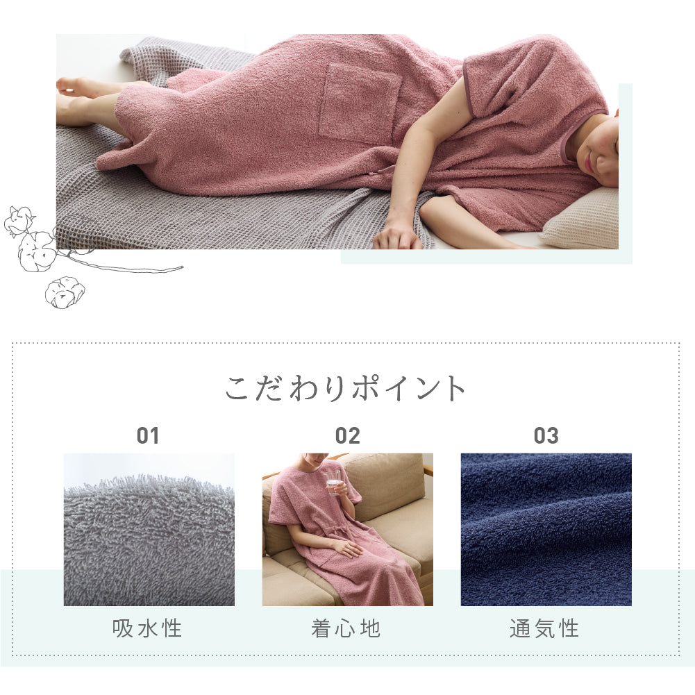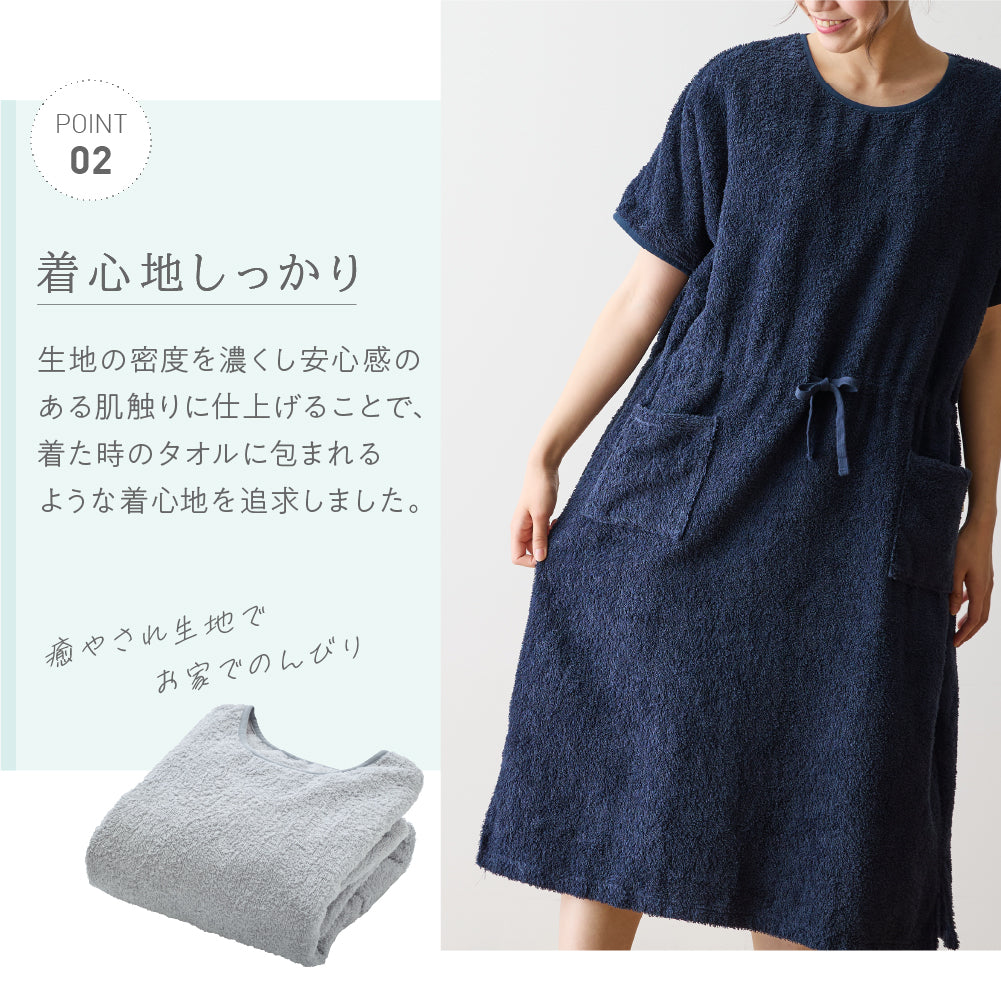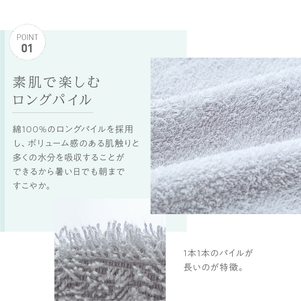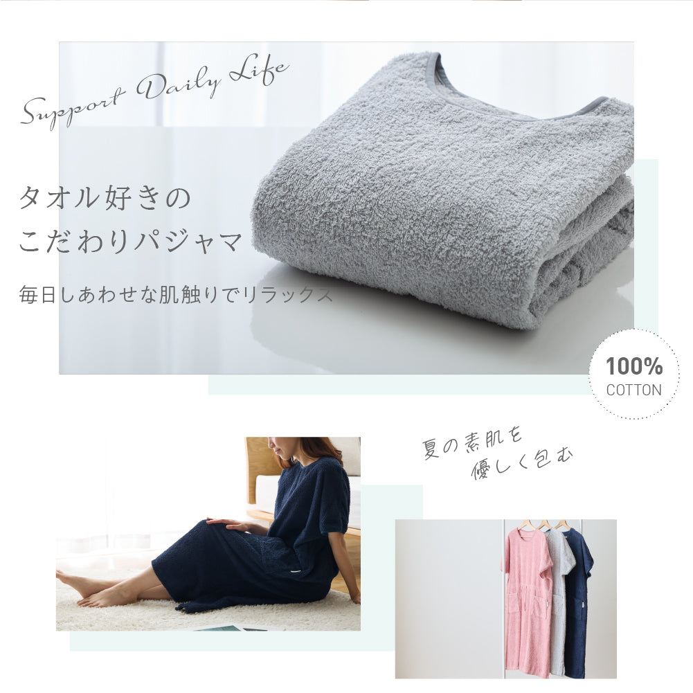 綿100%のロングパイルを採用し、着た時のタオルに包まれるような着心地を追求したタオル好きのこだわりパジャマワンピースです。ボリュームたっぷりの肌触りと抜群の吸水性で、暑い夜でも朝まで快適に過ごせます。毎日しあわせな肌触りで、リラックスタイムにもぴったり。
